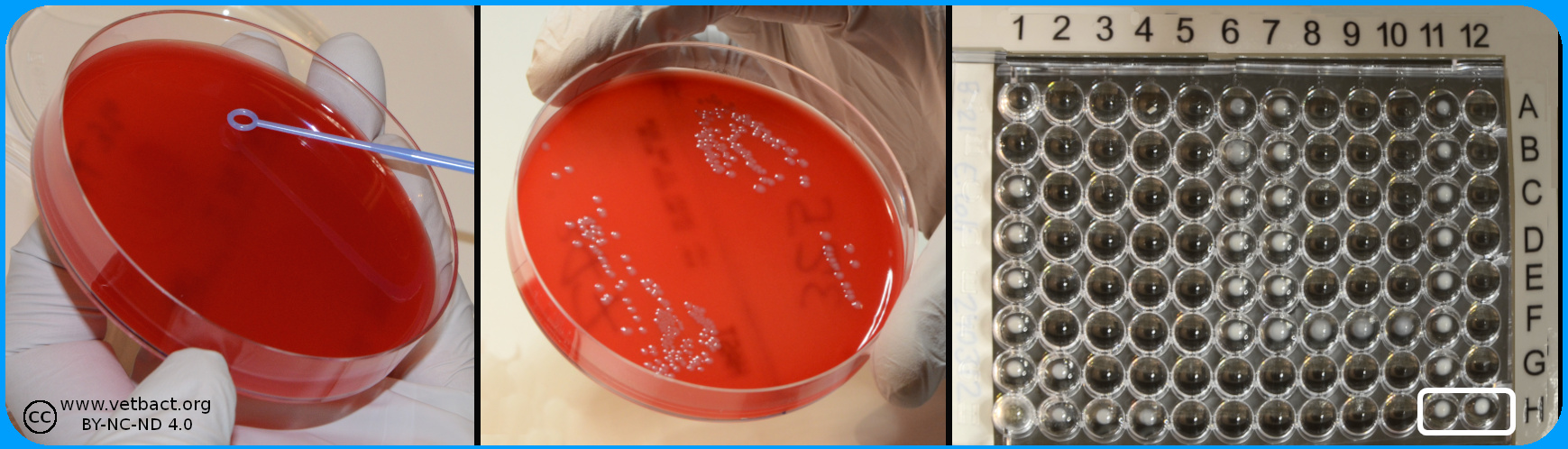Bacteria whose sensitivity against different antibiotics is to be tested are taken from a pure culture and homogenised with a supsension of ultra clean water or NaCl to obtain a fixed concentration of bacterial suspension, which means a turbidity of 0.5 McFarland. A part of the suspension is then mixed with Mueller-Hinton broth to obtain the desired concentration (104-105 bacteria/ml). For weak and slow growing bacteria, 5% serum is mostly added to achieve the desired growth. Thereafter a standard volume of this bacterial suspension is inoculated in each well and the microtiter plate is sealed with plastic and incubated for the optimal culture conditions of the tested bacteria, such as time, temperature and atmosphere. After incubation, the growth control is visually checked to ensure growth in the wells that do not contain antibiotics. Thereafter, growth or not growth is read in the different wells with antibiotics. In the well with the lowest concentration of antimicrobials that completely inhibits bacterial growth detected by the eye is decided as the MIC expressed in mg/L or μg/ml. To determine the sensitivity of the bacterium, the MIC value obtained is compared with breakpoints (ECOFF) for current antibiotics in of the scientific committees´guidelines for antimicrobial resistance, such as the European Committee on Antimicrobial Susceptibility Testing (EUCAST, https://www.eucast.org/mic_distridutions_and ecoffs).